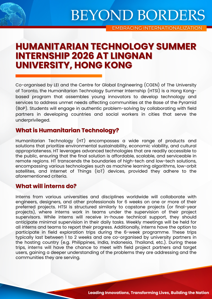 Call for Application to Humanitarian Technology Summer Internship 2026 at Lingnan University, Hong Kong