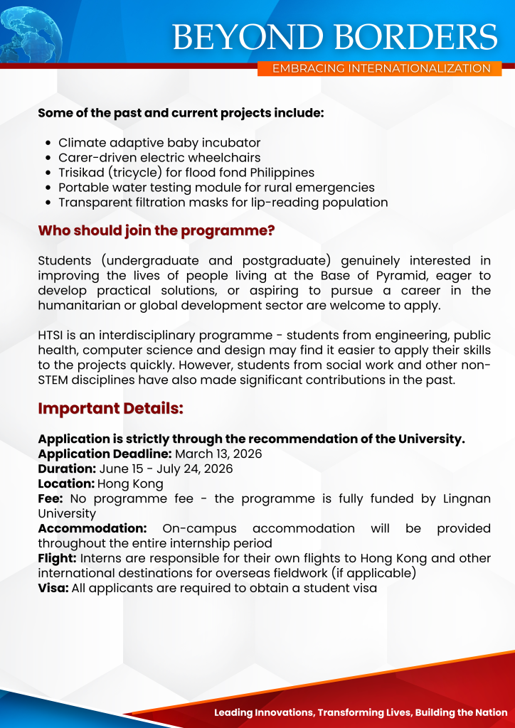 Students from Batangas State University – Alangilan Campus have safely arrived in Hong Kong to participate in the 6-week Humanitarian Technology Summer Program hosted by Lingnan University. Accompanied by their faculty companion, Engr. Anela Salvador, the students will engage in interdisciplinary learning and collaborative projects aimed at developing sustainable and humanitarian technologies. This international mobility…